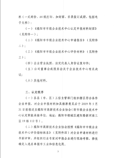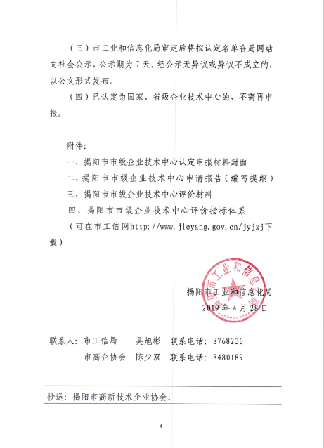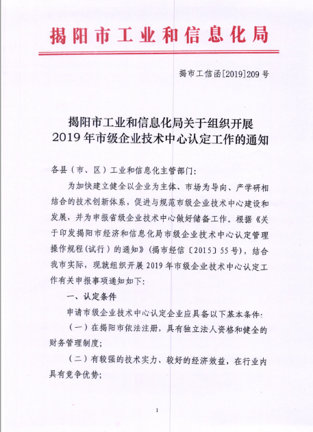 揭陽市工業(yè)和信息化局關(guān)于組織開展2019年市級(jí)企業(yè)技術(shù)中心認(rèn)定工作的通知