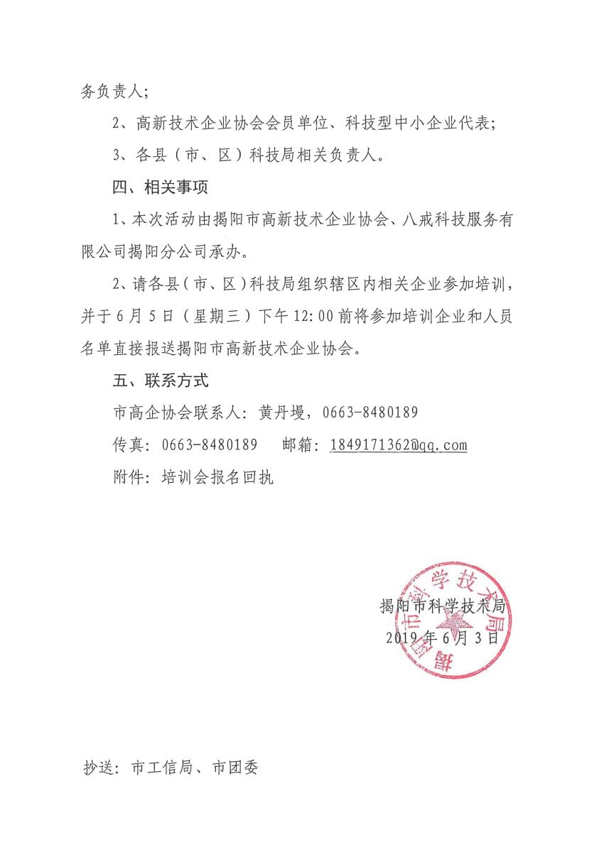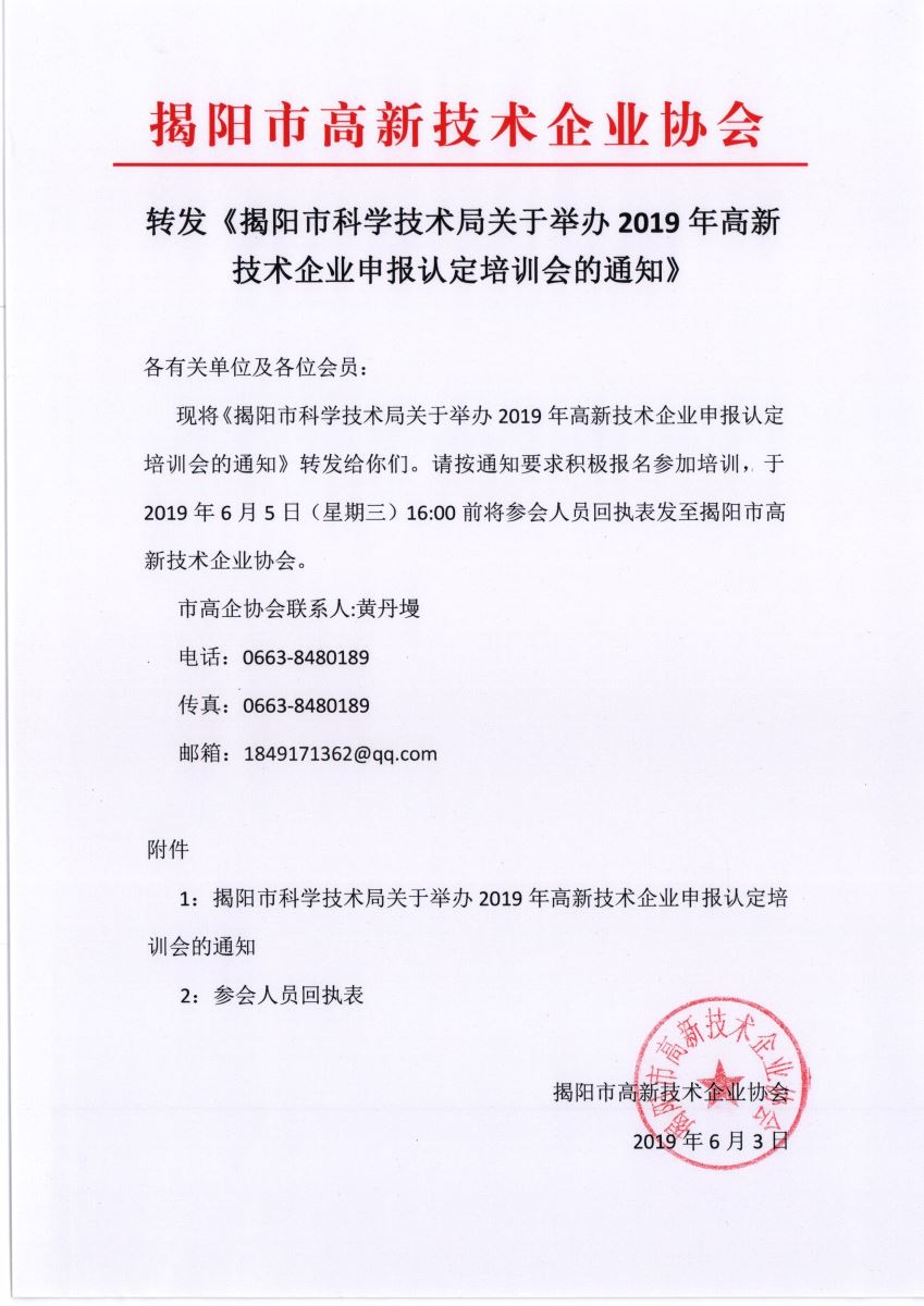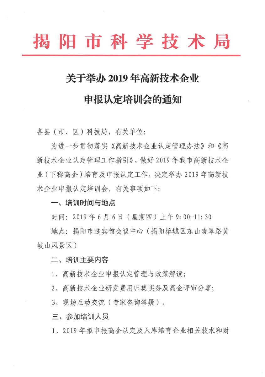 轉(zhuǎn)發(fā)《揭陽市科學(xué)技術(shù)局關(guān)于舉辦2019年高新技術(shù)企業(yè)申報(bào)認(rèn)定培訓(xùn)會(huì)的通知》