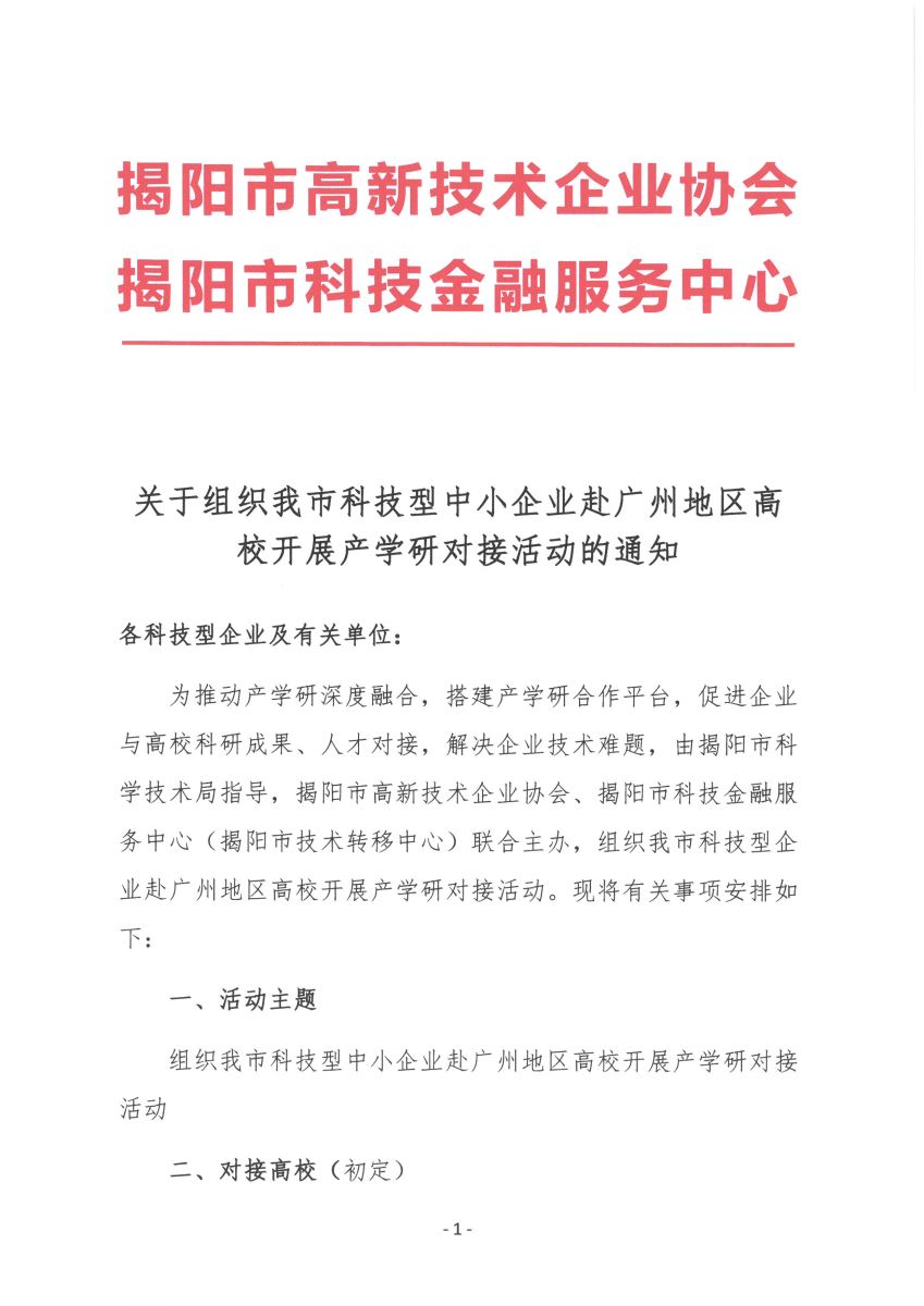 關(guān)于組織我市科技型中小企業(yè)赴廣州地區(qū)高校開展產(chǎn)學(xué)研對接活動(dòng)的通知