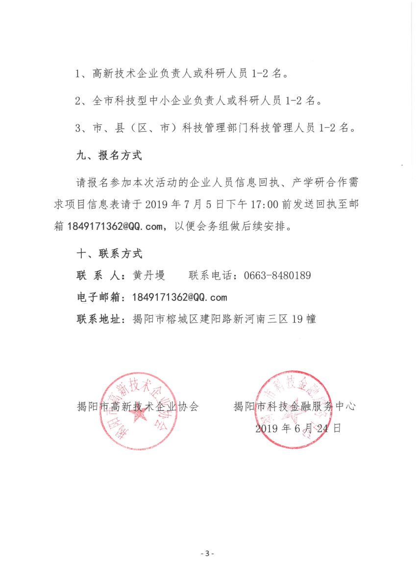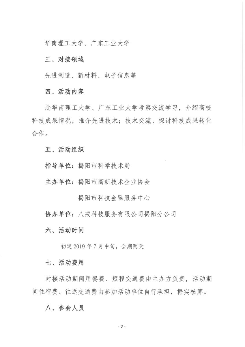 為推動(dòng)產(chǎn)學(xué)研深度融合,搭建產(chǎn)學(xué)研合作平臺(tái),促進(jìn)企業(yè)與高校科研成果、人才對接,解決企業(yè)技術(shù)難題,由揭陽市科學(xué)技術(shù)局指導(dǎo),揭陽市高新技術(shù)企業(yè)協(xié)會(huì)、揭陽市科技金融服務(wù)中心(揭陽市技術(shù)轉(zhuǎn)移中心)聯(lián)合主辦,組織我市科技型企業(yè)赴廣州地區(qū)高校開展產(chǎn)學(xué)研對接活動(dòng)。初定時(shí)間:2019年7月中旬,會(huì)期兩天,地點(diǎn):華南理工大學(xué)、廣東工業(yè)大學(xué)。歡迎各企業(yè)單位積極報(bào)名參加,發(fā)送回執(zhí)至郵箱 1849171362@QQ.com,以便會(huì)務(wù)組做后續(xù)安排。