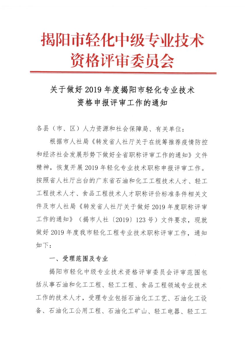 關于做好2019年度揭陽市輕化專業(yè)技術資格申報評審工作的通知