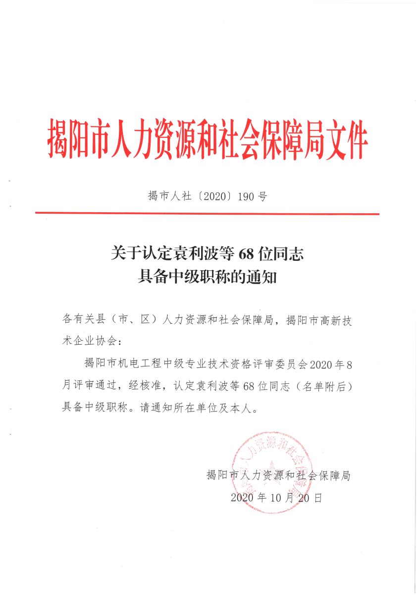 關于認定袁利波等68位同志具備中級職稱的通知