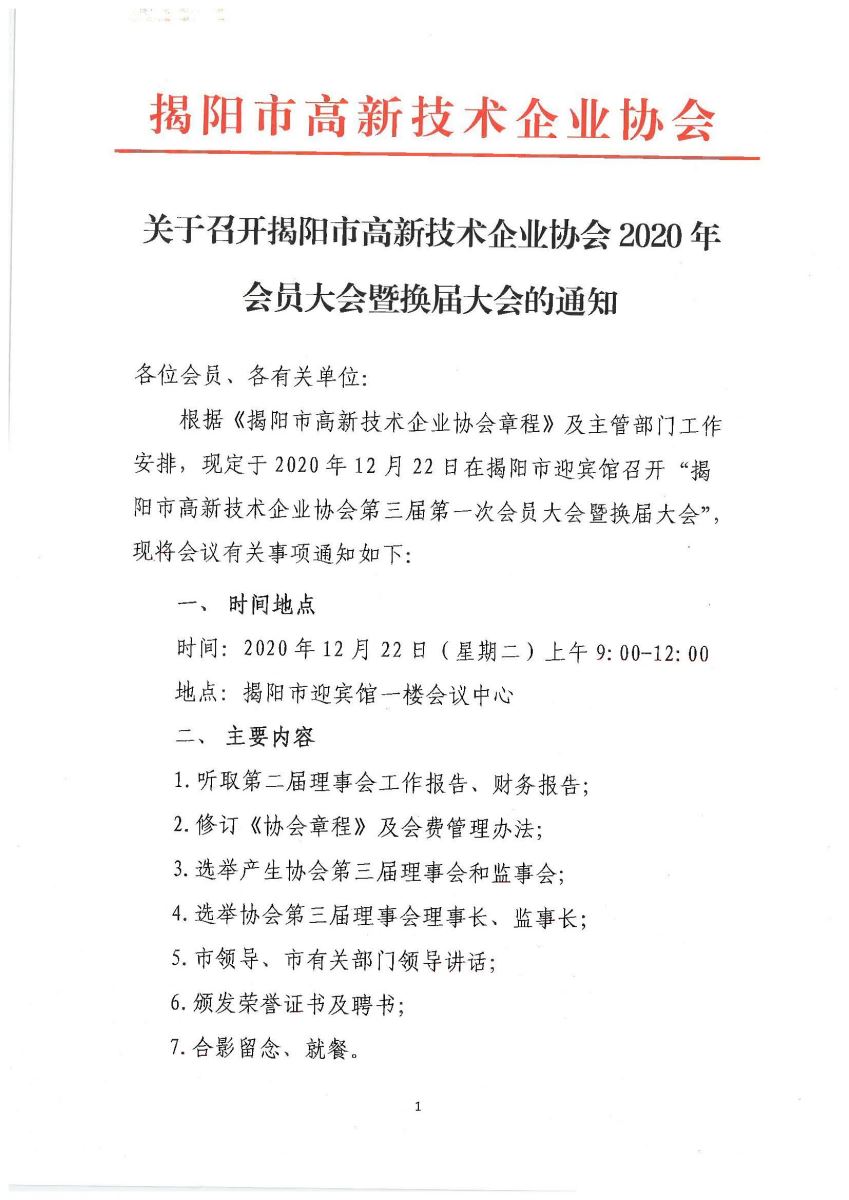 關(guān)于召開揭陽市高新技術(shù)企業(yè)協(xié)會(huì)2020年會(huì)員大會(huì)暨換屆大會(huì)的通知